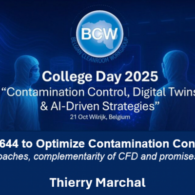 Our President and Secretary General, Thierry Marchal presented the topic: “Using ISO 14644 to Optimize Contamination Control Strategy: limitations of traditional approaches, complementarity of CFD and promises of Clean Room Digital Twin” at the Belgian Cleanroom Workshop held in Antwerp on 21 October.
